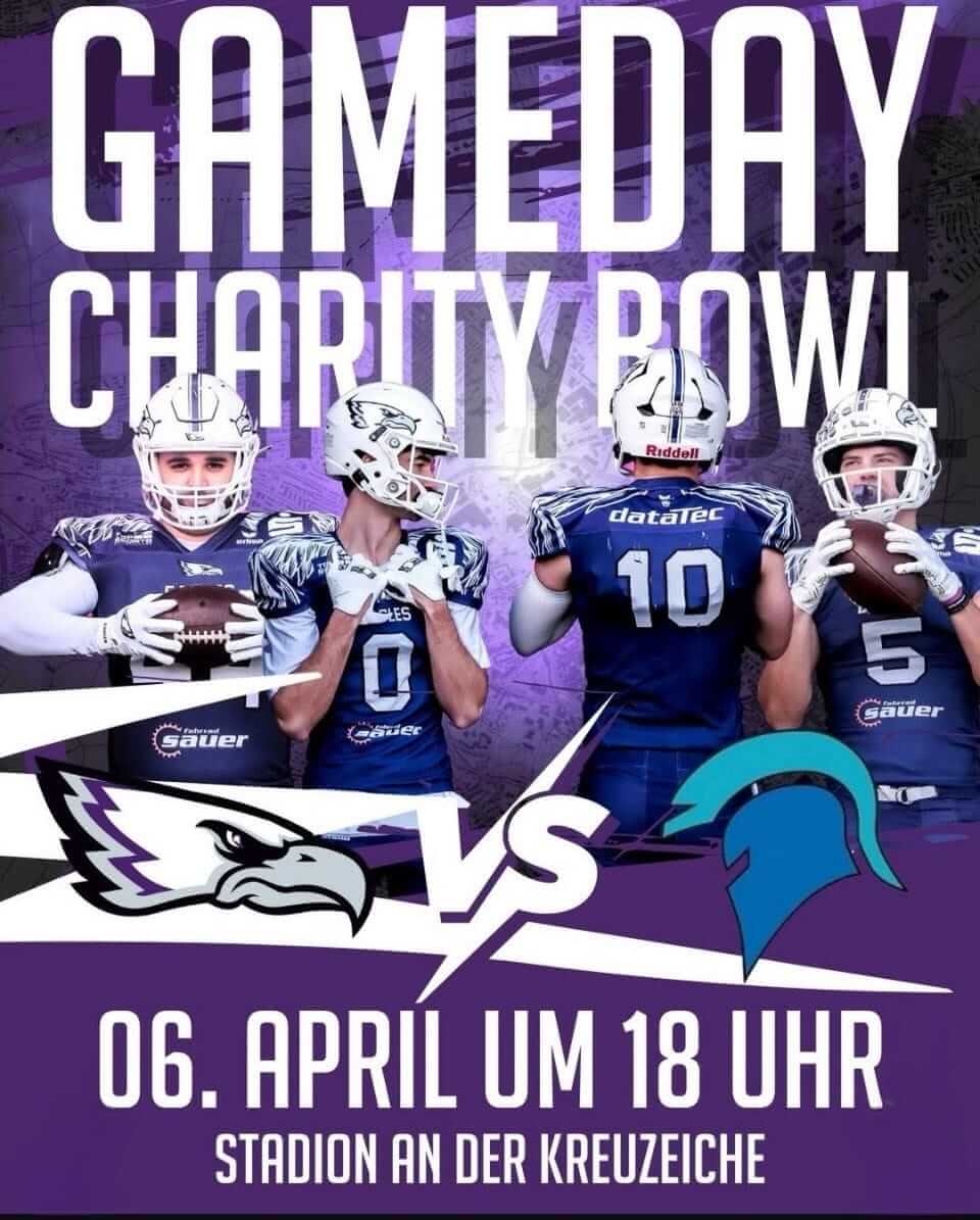 Monday Night Lights! Am Ostermontag, den 06.04.2026 steigt im Stadion an der Kreuzeiche unser alljährlicher Charity Bowl. Dieses Jahr empfangen wir die Albershausen Crusaders um 18 Uhr zu einem wunderbaren Flutlicht-Spiel.